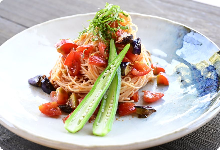 うきは産の旬の野菜を使ったトマトベースの冷製パスタです。