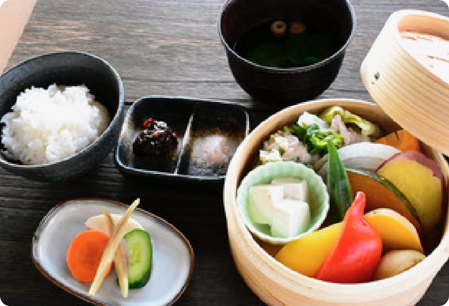 野菜本来の味を楽しむせいろ蒸しです。大地の恵みを蕎麦味噌と岩塩でお楽しみください!