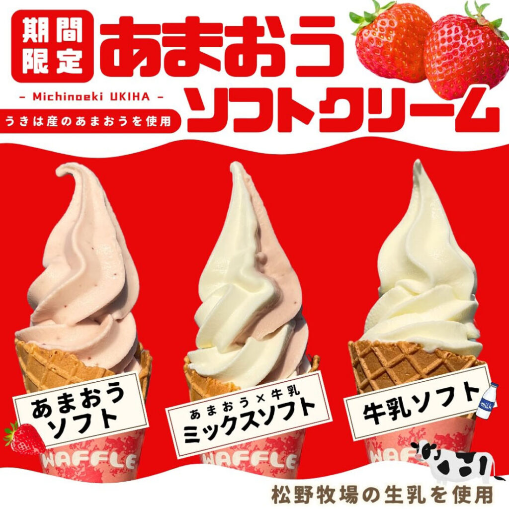 道の駅うきはでは人気の品種「あまおう」をはじめ、希少な白い品種の「みるくいちご」など、多数のいちごを出荷頂いております。当日の出荷状況については、お気軽にスタッフにお声掛けください!また、入り口付近のファストフードコーナーでは、期間限定であまおうソフトクリームを販売しています。あまおうも牛乳ももちろんうきは市産!うきはの美味しいものが詰まったソフトクリームです。ぜひ味わってみてください⭐️